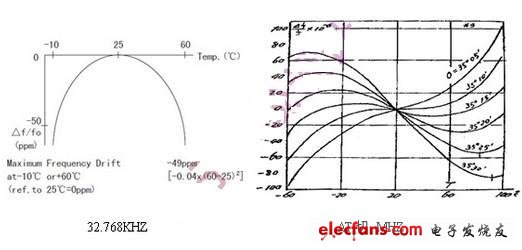 上文提到石英晶体还有一个重要的特性--温漂。所有的石英晶体材料做成的频率器件,均有一定的温漂。温漂成为影响石英晶体谐振器及石英晶体振荡器频率精度的重要因素。温补钟振(TCXO),恒温钟振(OCXO),都是针对晶体的频率温度特性做相应的补偿,频率精度TCXO小于±2.5ppm,OCXO小于±10ppb(1ppb=10-3ppm),甚至更高。温度补偿,成为弥补石英晶体温漂的重要手段。然而,市面上针对KHZ级别的温补钟振少之又少,其原因,我可以从晶体的切型方面分析。